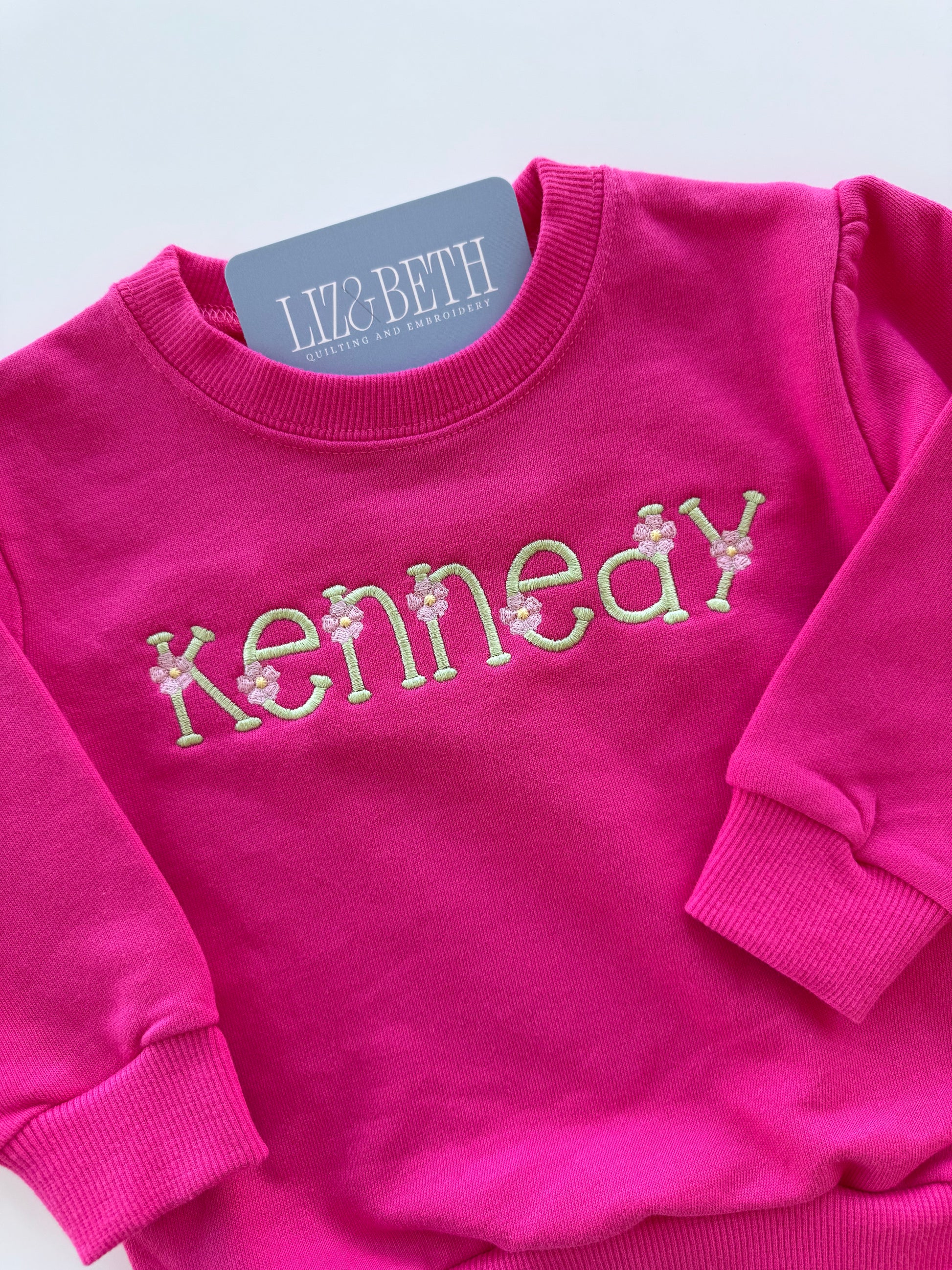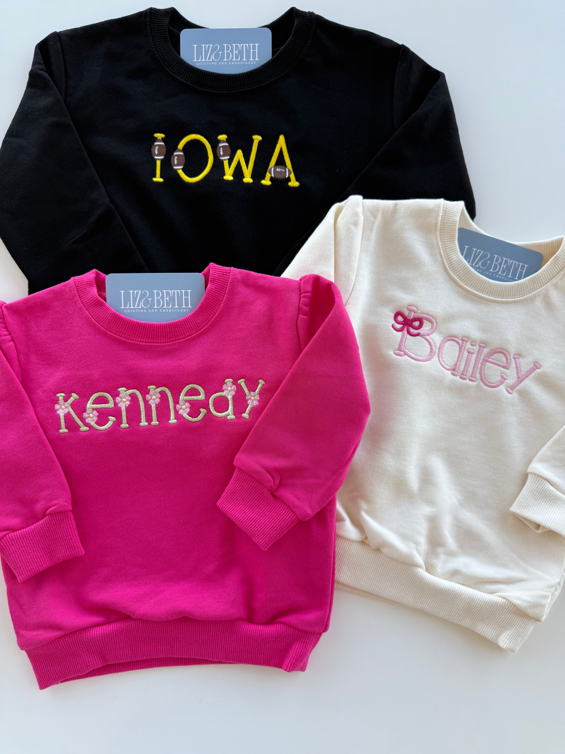 Cozy, classic, and made just for them. Our custom kids sweatshirts are embroidered with your child’s name or favorite word for a timeless, elevated look that’s perfect for everyday wear or gifting.