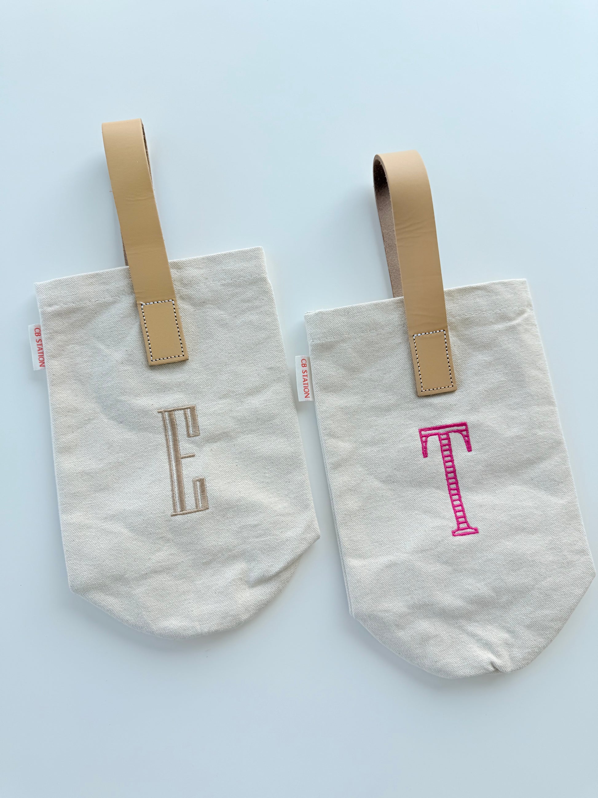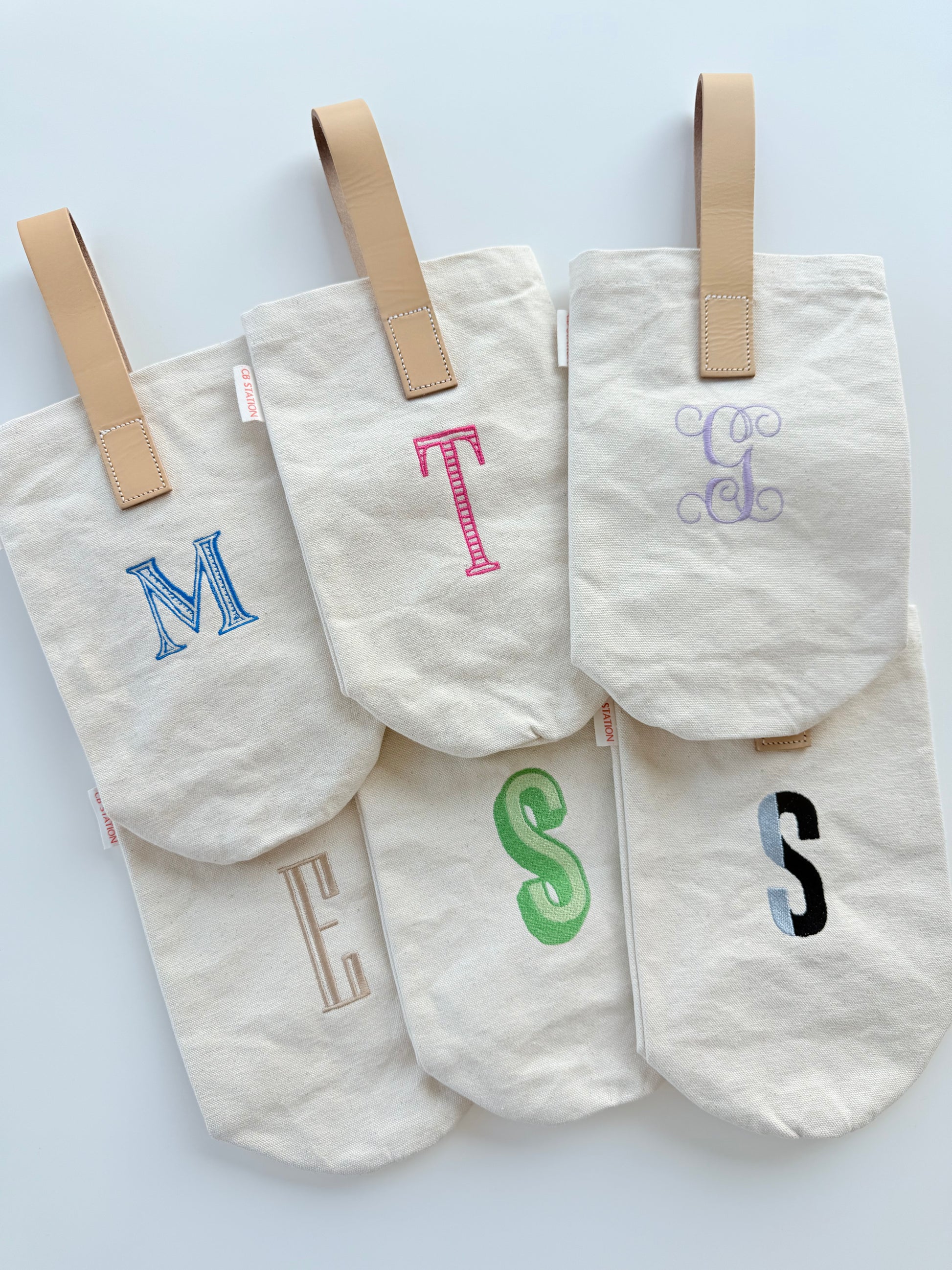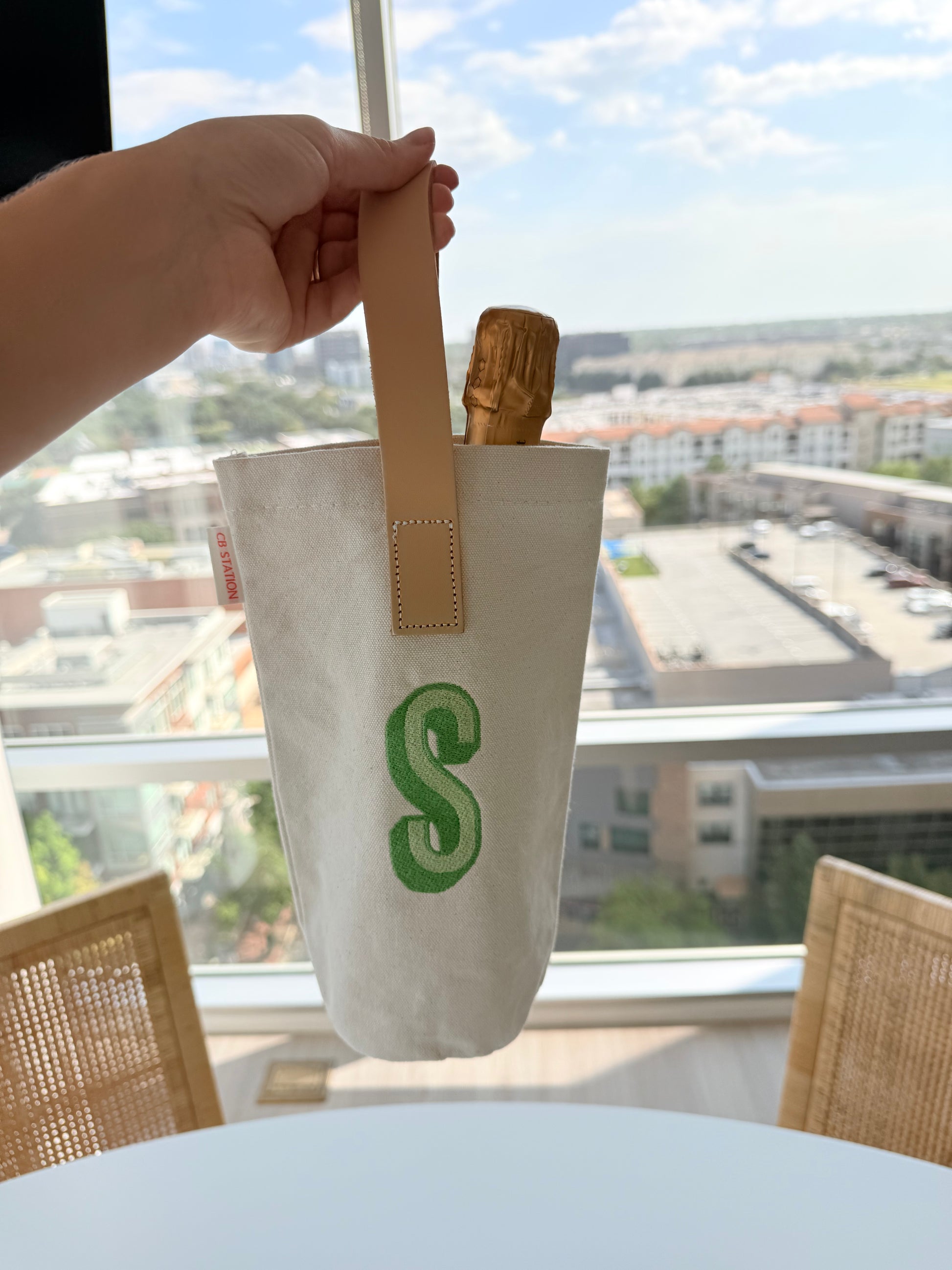Single wine bottle tote bag with leather strap, great for gifts! Fits one wine bottle, slightly smaller monogram available compared to the duo wine bottle tote bag.