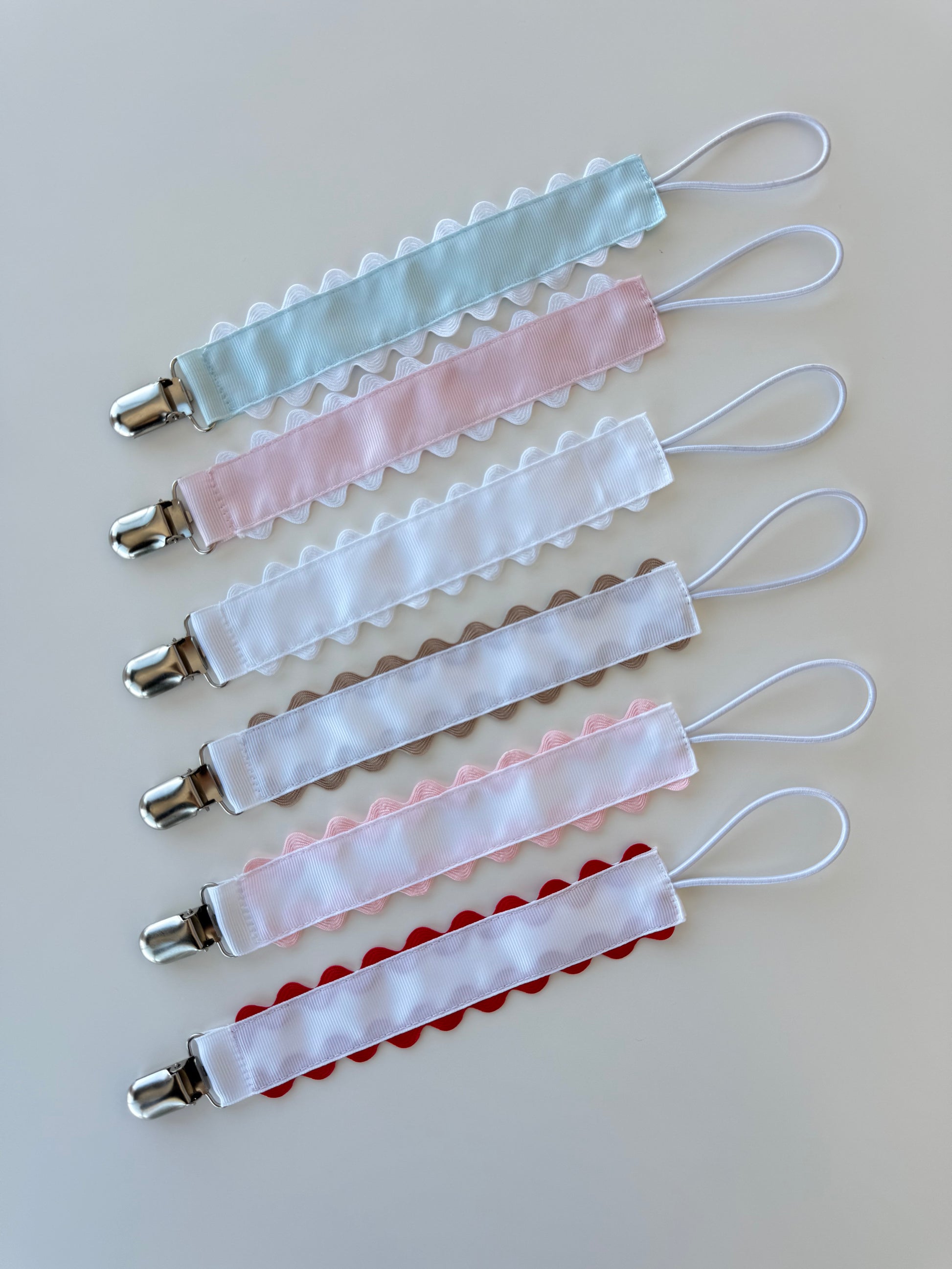 Pacifier clip with elastic loop to attach any pacifier to be clipped on a shirt or strap. Features a white trim and comes in Pink, Blue or White.