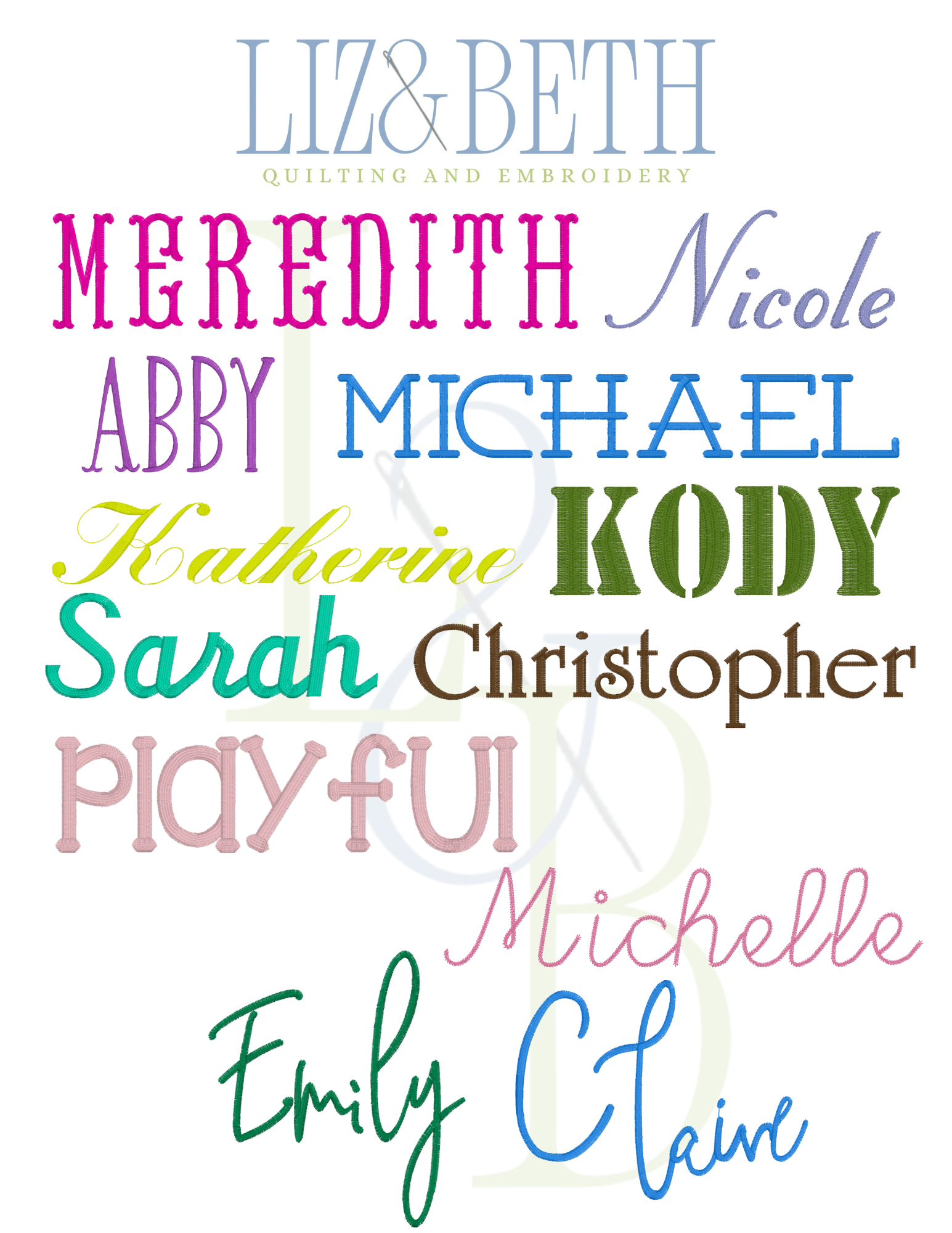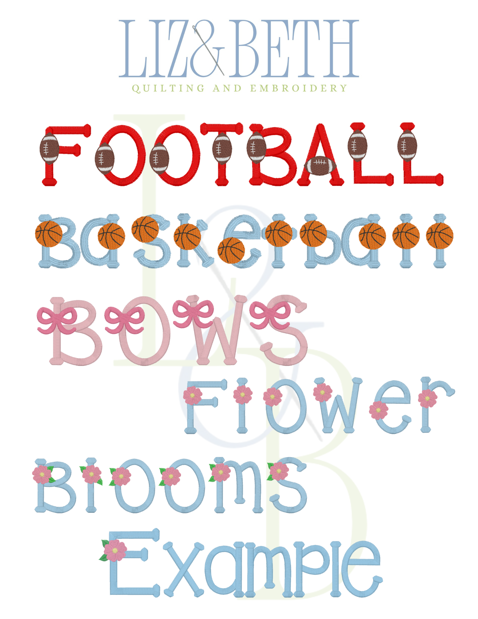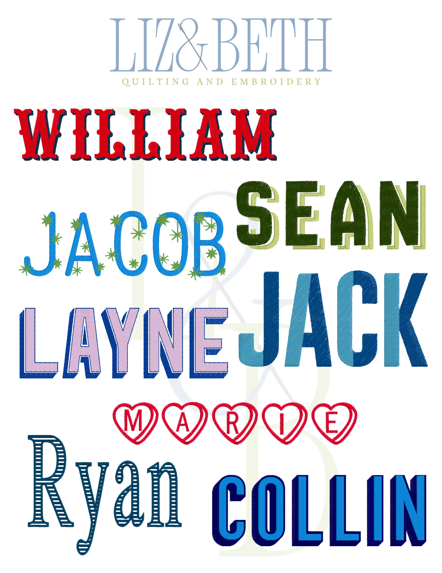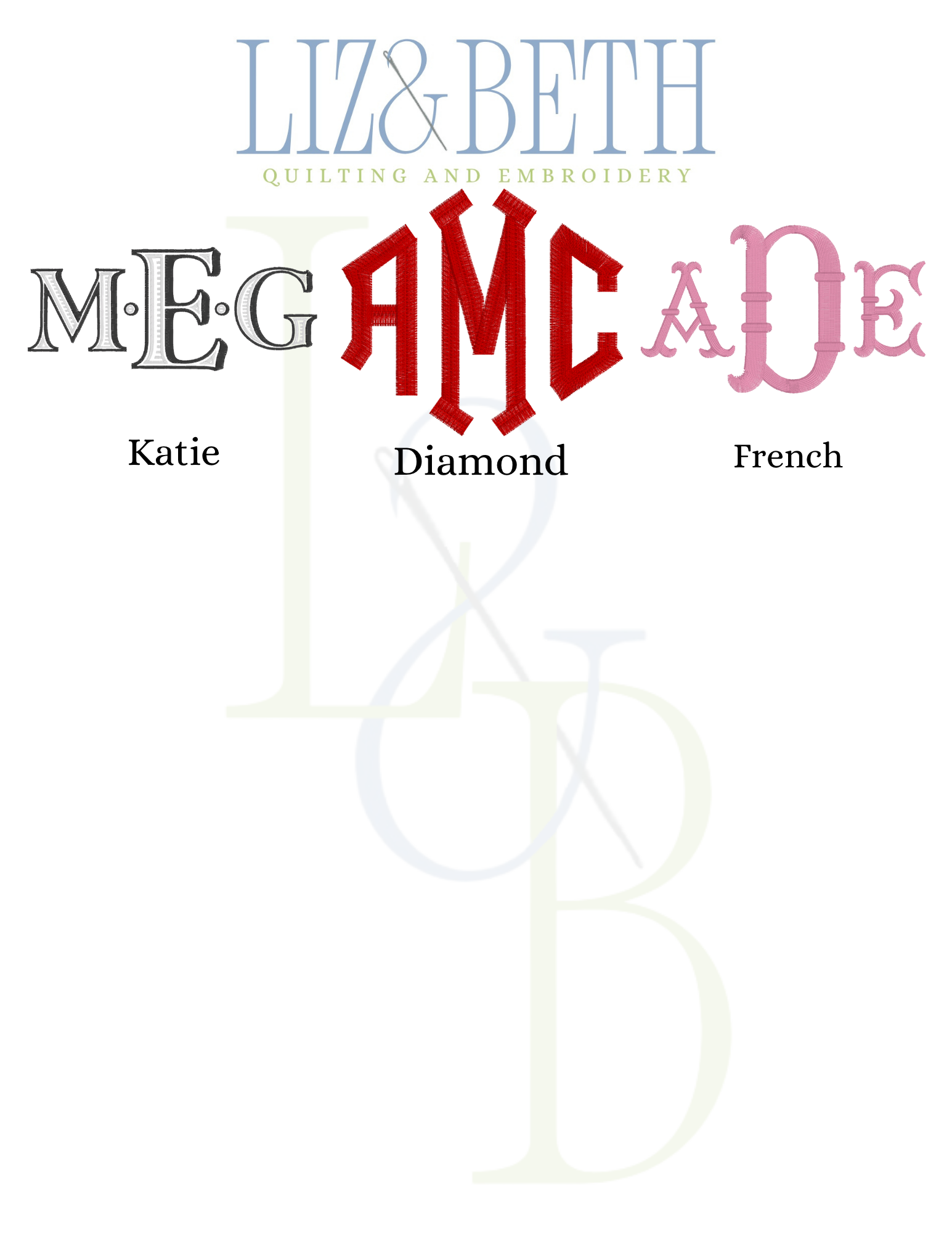 Customizable with initials or monogram. Example shown: Emerald Green bag with matching green thread with C in Engraved font. Black Bag, with Sean font in Black and Grey. Pink Bag with Engraved "S".